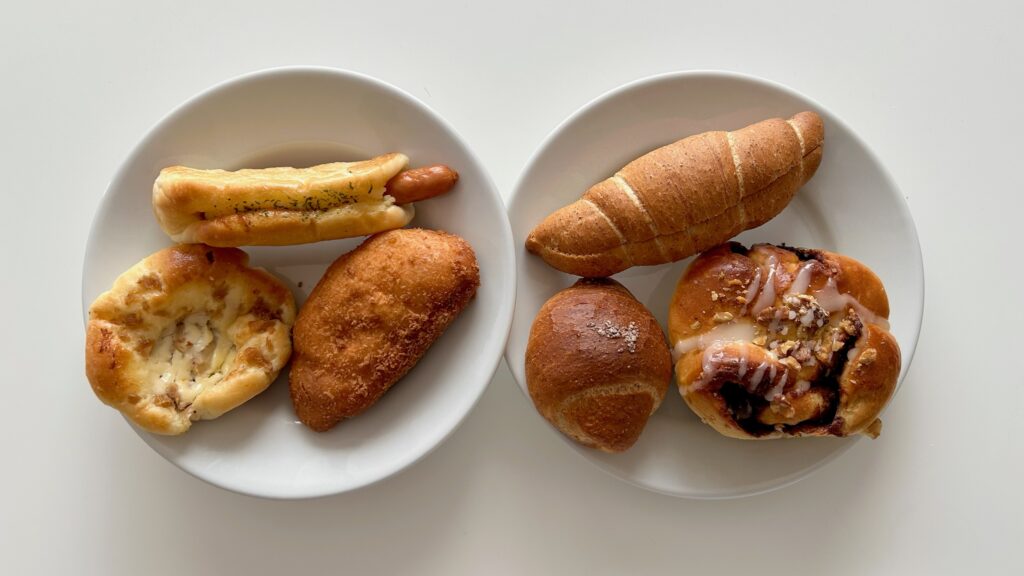 塩パン、クレッセントピーナッツ、シナモンロールを購入。(写真左から)